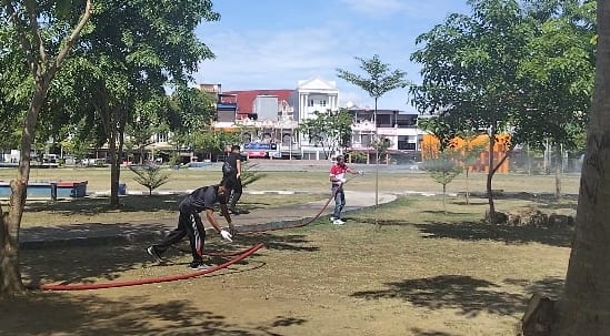 Kegiatan tersebut meliputi penyiraman rumput dan tanaman, penataan tanaman hias, serta pengaturan area tempat penjualan dan parkiran mobil angkutan di sekitar taman.